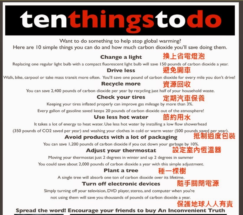 我們能做的事:(1)減少二氧化碳排放、(2)做好資源回收、(3)使用綠色標章產品、(4)提高能源政策…等。從日常生活中的食、衣、住、行中,只要我們多注意節省能源,小努力也可以變成減少地球暖化的大功臣。